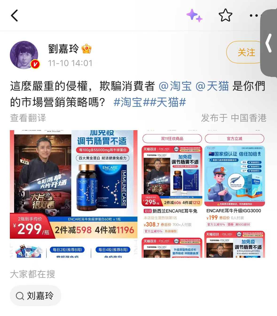 11月10日,演员刘嘉玲发布微博,晒出两张淘宝页面截图,并喊话淘宝、天猫:“这么严重的侵权,欺骗消费者,淘宝、天猫,是你们的市场营销策略吗?”