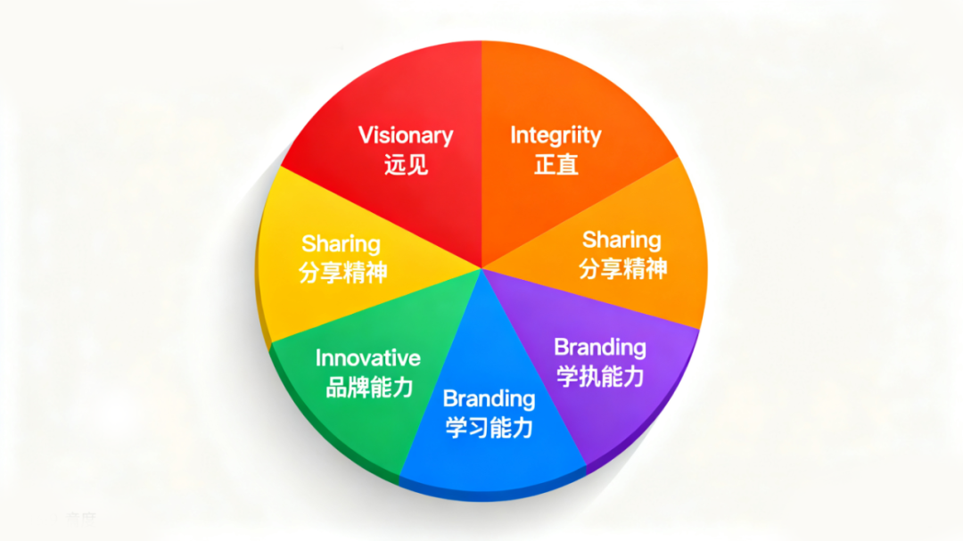 Visionary(远见)、Integrity(正直)、Sharing(分享精神)、Innovative(创新能力)、Branding(品牌能力)、Learning(学习能力)、Execution(执行力)。