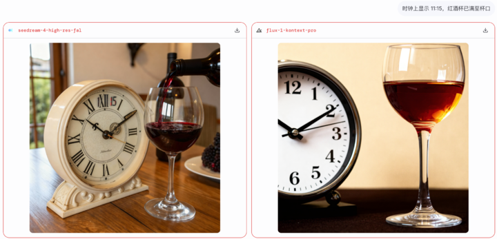我们在大模型竞技场、豆包 Seedream、以及 nano banana 1.0 版本多次尝试,没有 AI 可以准确显示时钟刻度,和一杯快满出来的红酒。