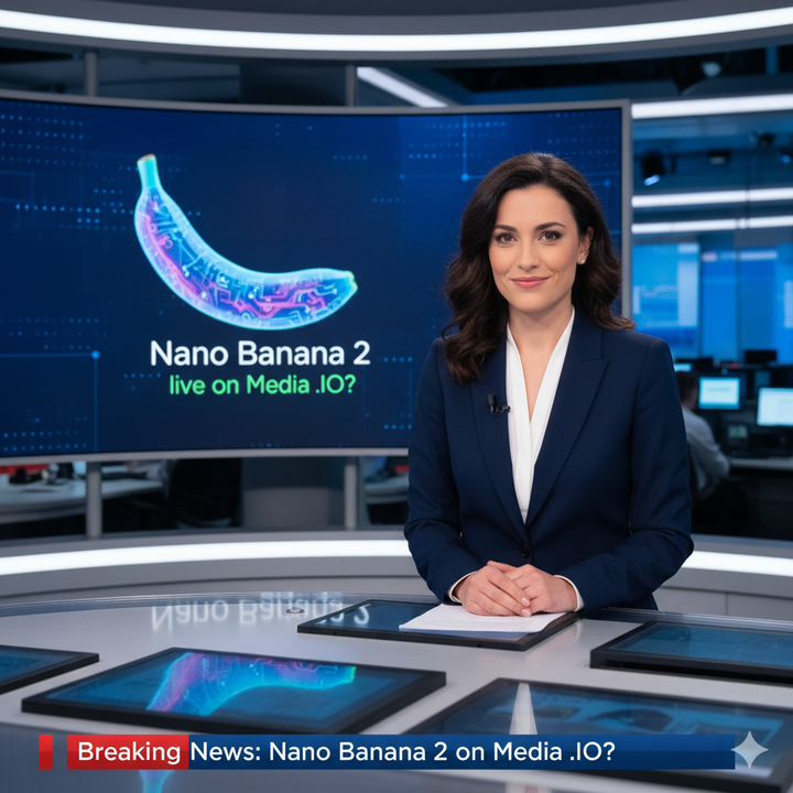 ▲ 提示词:50mm big budget live broadcast 8k photograph close-up an attractive italian age 30 wry female news anchor. She is at a news desk and on a screen behind her is a bio engineered Banana with text “Nano Banana 2 live on Media .IO?” Live news shot. There is a red and blueckhyron on the bottom of the image that says “Breaking News: Nano Banana 2 on Media .IO?”|图片来源 x@BrentLynch