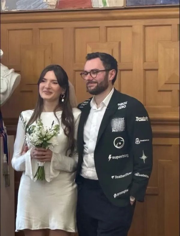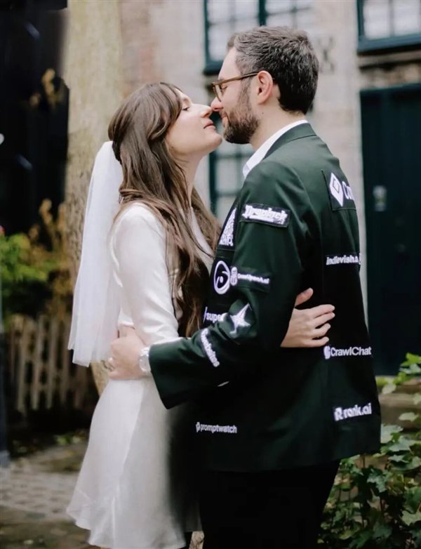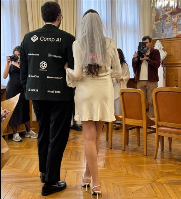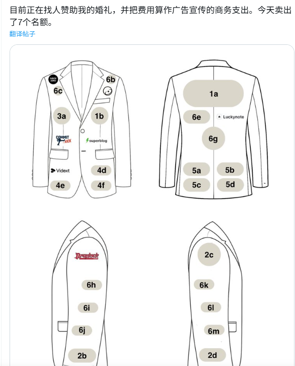 他决定将品牌logo印西装上,结婚当天把自己当作“人体广告牌”,通过对外出售西装外套上的广告位筹钱。
