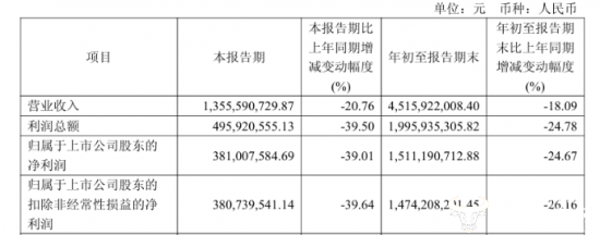 从产品来看,今年前三季度,口子窖只有低档白酒实现了同比正增长,但作为营收主力的高档白酒销售收入为29.61亿元,较上年同期的41.12亿元减少27.98%,中档白酒销售收入同比下降15.38%至0.41亿元。而公司前三季度毛利率同比减少3.81个百分点至70.96%,其中第三季度同比减少9.25个百分点至62.66%。