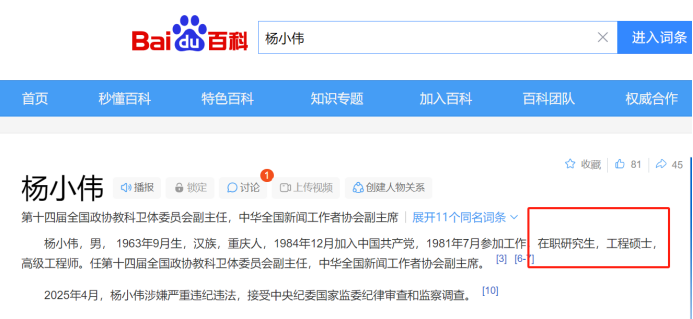 另有资料显示,杨小伟1998年毕业于重庆大学计算器应用专业,获本科学士学位,当时杨小伟已经25岁,显然这是成人教育文凭。