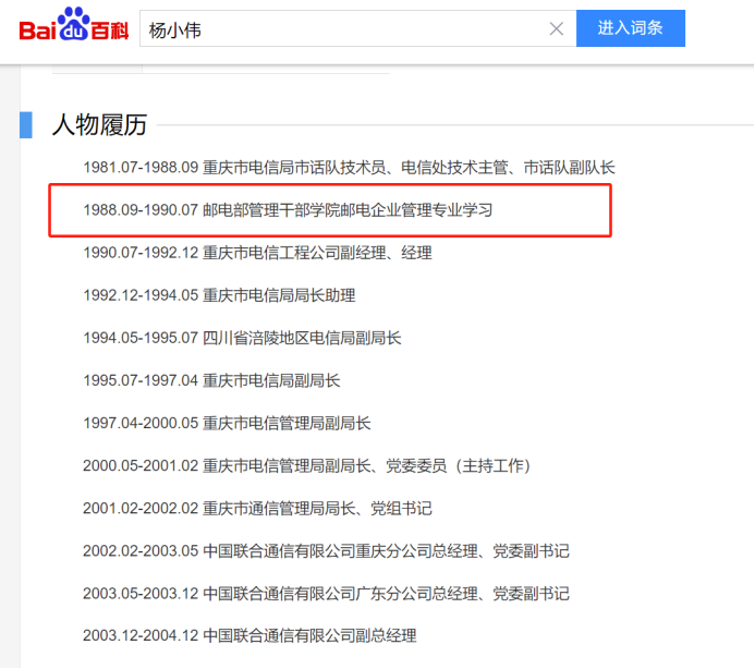 杨小伟在三大运营商体系内无人不知,他早年在重庆邮电系统工作,一开始当重庆电信局市话队技术员,后来一直升到重庆市通信管理局局长。