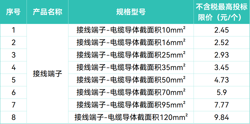 本项目设定了严格的最高投标限价。其中,基准型号“阻燃铝电缆-ZA-VLV(4×25)”不含税单价上限为11.97元/米;接线端子单价限价从2.45元/个(10mm²)至9.84元/个(120mm²)不等;