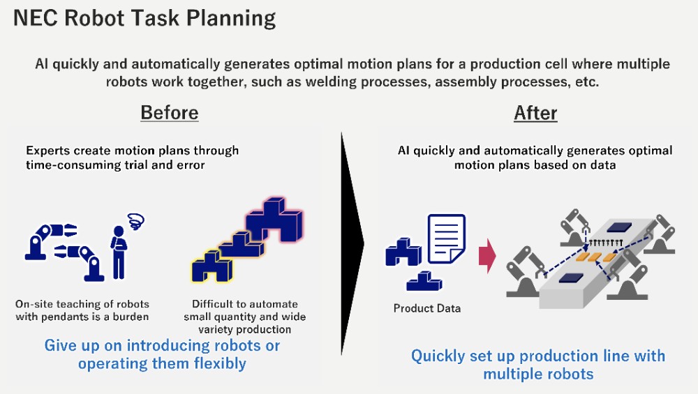 作为 NEC BluStellar 计划的重要组成部分,NEC 的“机器人任务规划”软件搭载了专有算法,可优化多机器人协同作业,并通过 AI 自动生成机器人运动规划。