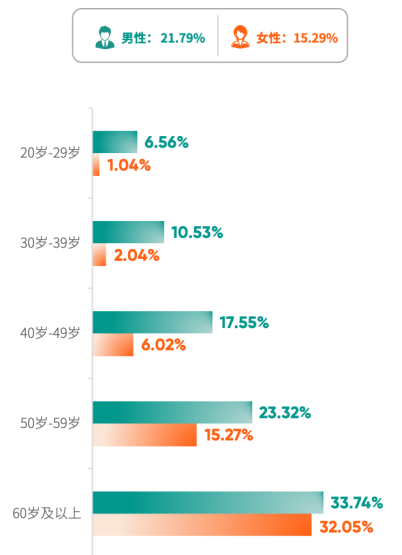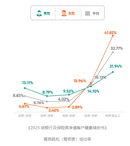 骨质疏松症已经成为我国50岁以上人群的重要健康问题,尤其多见于女性。从50岁开始,女性银行及保险高净值客户骨质疏松(骨密度)检出率高于男性,60岁及以上检出率超过41%,接近同年龄段男性的2倍,相当于每10人中,有超过4个人拥有“散装骨头”,与这一年龄段雌激素水平缺乏有关。
