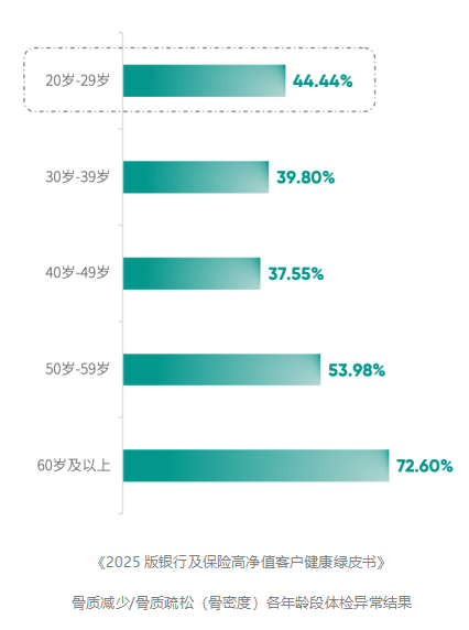 如今,“我碎了”成了年轻人的高频口头禅,这届年轻人“失控”的还不止尿酸,骨头也在偷偷变“脆”。绿皮书显示,银行及保险高净值客户骨质减少/骨质疏松(骨密度)异常检出率超50%,也就是2个人中就有一个“骨脆”。其中,20-29岁银行及保险高净值客户有44.44%存在骨质减少/骨质疏松(骨密度)。