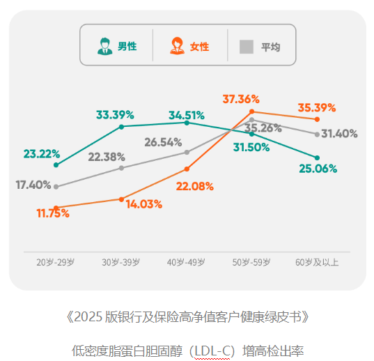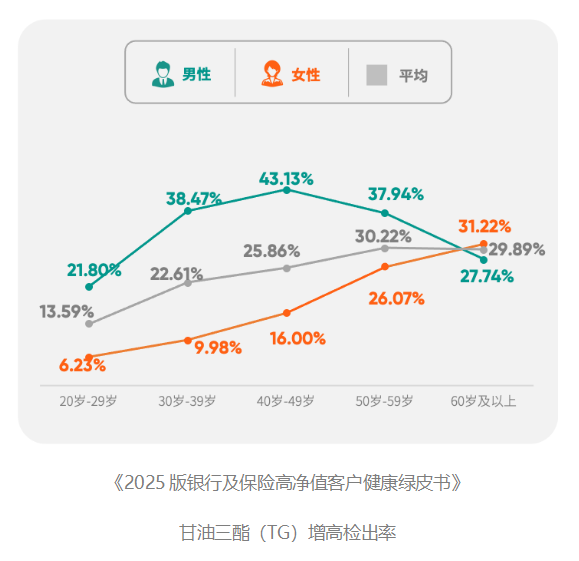 根据绿皮书甘油三酯(TG)增高、总胆固醇(TC)增高、低密度脂蛋白胆固醇(LDL-C)增高的性别年龄分布情况显示:总体来看,50岁-59岁银行及保险高净值客户检出率最高,分别为30.22%、47.55%和35.26%。