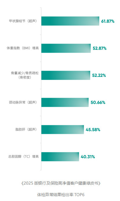 排除与性别相关的前列腺异常(超声)和乳腺结节(超声),甲状腺结节(超声)在银行及保险高净值客户中的检出率最高,达到61.87%,往下依次为体重指数(BMI)增高、骨量减少/骨质疏松(骨密度)、颈动脉异常(超声)、脂肪肝(超声)和总胆固醇(TC)增高,检出率均超过四成。