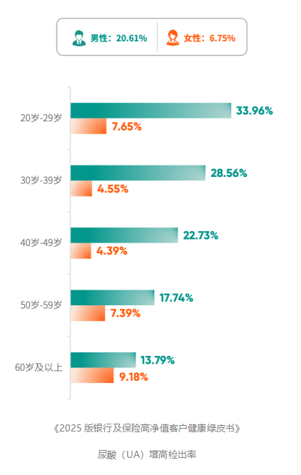 绿皮书显示,各个年龄段男性尿酸(UA)增高检出率均高于同年龄段女性。作为大家眼中的“老年病”,20岁-29岁男性银行及保险高净值客户的尿酸成绩单竟格外醒目,10个“00后”超过3个陷入“高尿酸危机”。任凭酒肉穿肠过,换来的却是这么“痛”的领悟。