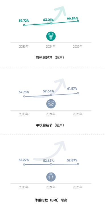对比近三年体检异常结果,前列腺异常(超声)、甲状腺结节(超声)和体重指数(BMI)增高历年检出率均超过50%。此外,前列腺异常(超声)、乳腺结节(超声)、总胆固醇(TC)增高、甲状腺结节(超声)、颈动脉异常(超声)等11项异常结果连年走高;空腹血糖(FBG)升高、幽门螺杆菌检测(呼气试验)阳性和尿酸(UA)增高连续三年检出率有逐年下降趋势。