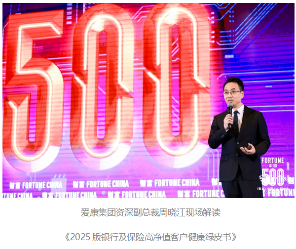 爱康集团作为战略合作伙伴,二度携手《财富》中国500强峰会,共同关注高净值人群的健康议题,并联合发布《2025版银行及保险高净值客户健康绿皮书》(以下简称“绿皮书”),旨在通过多维度的体检大数据分析与专业的健康管理解决方案,为高净值人群提供清晰的“健康行动科学指南”,助力其构建高品质人生,同时推动社会重新审视财富与健康之间的紧密关系。