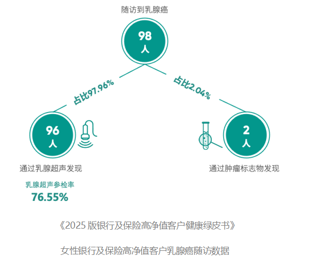 绿皮书显示,共随访到乳腺癌98人,其中96例通过乳腺超声检查发现(占比97.96%);2例通过肿瘤标志物检测发现(占比2.04%),所有乳腺癌患者均在临床确诊。值得注意的是,有2位是35岁-40岁女性。