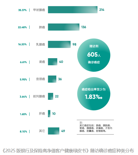 2024年9月1日至2025年8月31日期间,在爱康集团体检的330,713位银行及保险高净值客户中,爱康集团至少随访到605人确诊癌症(癌症随访数据统计截止2025年9月28日),癌症检出率至少为1.83‰。由于存在部分客户在爱康提醒后未进一步到医院检查,从而无法确认是否患癌,以及到医院进一步就诊后确认患癌,但未反馈到爱康的。因此,实际确诊的癌症患者数量预计高于这个数字。