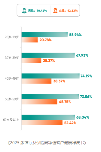 绿皮书显示,银行及保险高净值客户体重指数(BMI)增高检出率为52.87%,男性检出率超7成,并且在各个年龄段的检出率都高于女性,主打一个“稳重”。