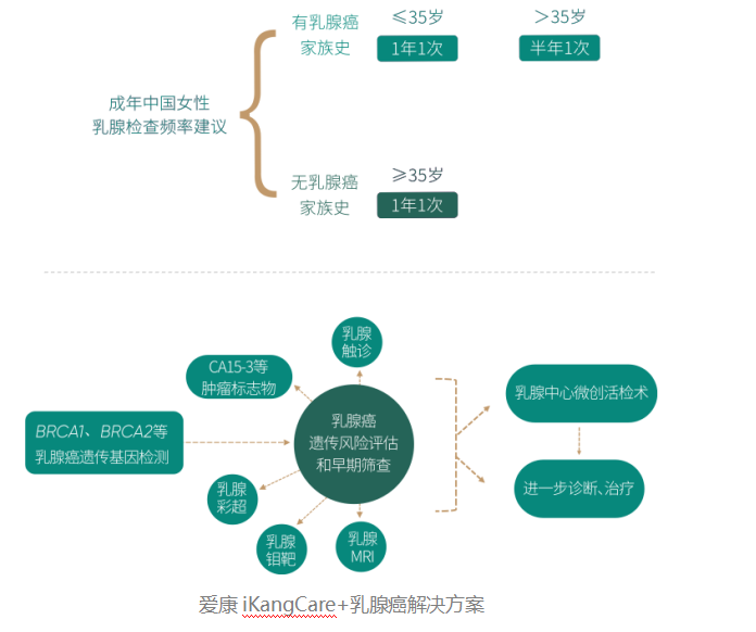 定期进行健康体检,是远离乳腺癌的重要措施。爱康建议:中国女性从35岁开始,乳腺检查频率建议一年一次;超过35岁且有乳腺癌家族史的女性,建议缩短到半年一次;如有BRCA基因突变的女性,则需要从18岁开始定期筛查。除触诊外,可结合乳腺超声、乳腺钼靶、乳腺磁共振MRI、肿瘤标志物等的针对性检查。