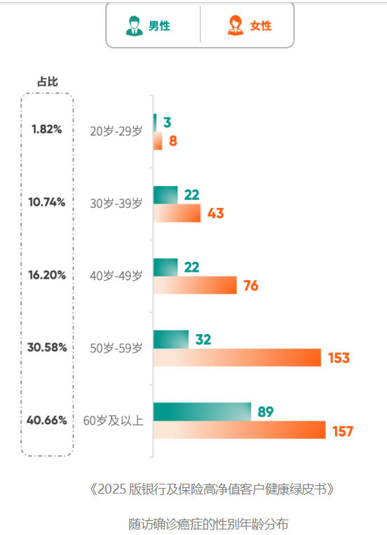绿皮书显示,40岁以下银行及保险高净值客户有76位确诊癌症,占比为12.56%,其中最年轻的是一位21岁女性,确诊为甲状腺癌;40岁及以上银行及保险高净值客户有529位确诊癌症,占比高达87.44%。