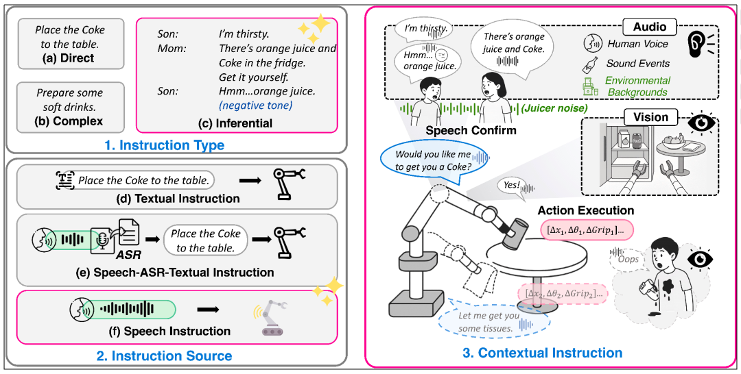 当前主流的 VLA 模型存在两⼤局限:(1)现有模型⼤多依赖于精确、显式的指令(如「拿起苹果」),⽆法理解隐含的意图。(2)现有⽅法的指令输⼊严重依赖于⽂本,即便使⽤语音,也需要先通过 ASR (Automatic Speech Recognition)技术转成⽂字,这丢失了语调、情感、说话⼈身份等副语⾔关键信息,更⽆法感知⻔铃、雷声等环境声音的语义。