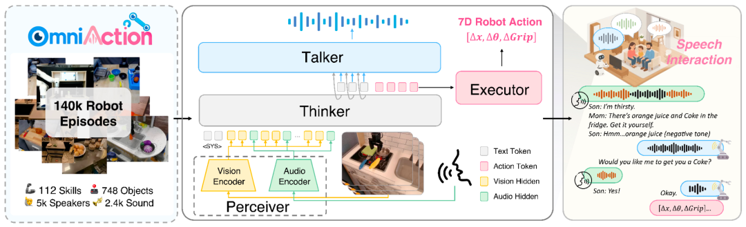 其核心是「感知-思考-回应- 执行」(Perceiver-Thinker-Talker-Executor) 的统⼀端到端架构: