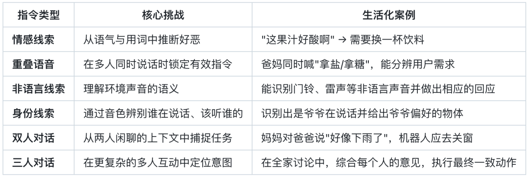 在⽇常⽣活中,⼈类很少发出⽣硬的命令式指令⸺「把杯子放到桌上」。更多时候,我们的真实意图隐藏在对话、语⽓、甚⾄环境声音中。