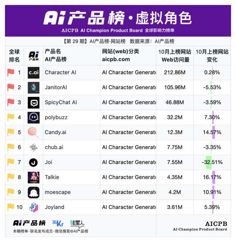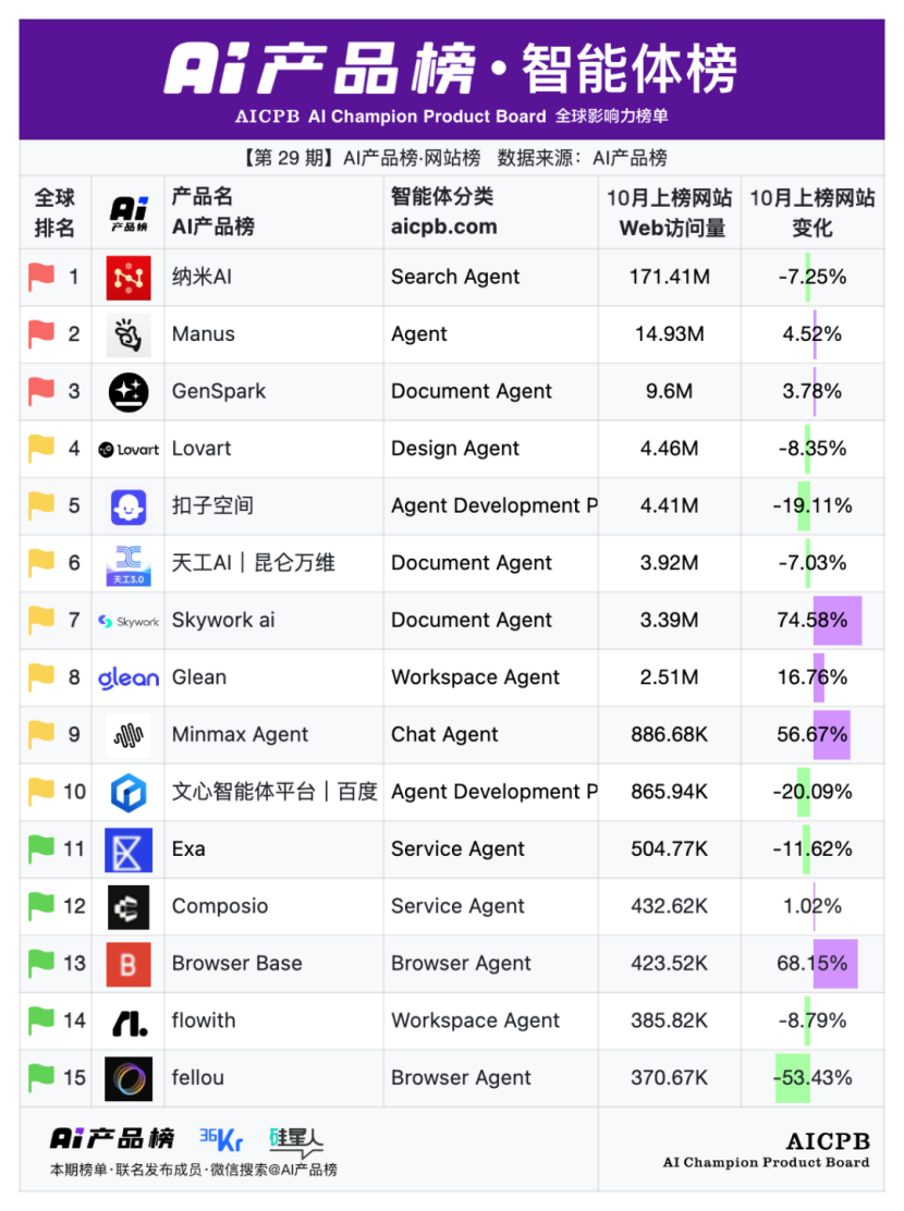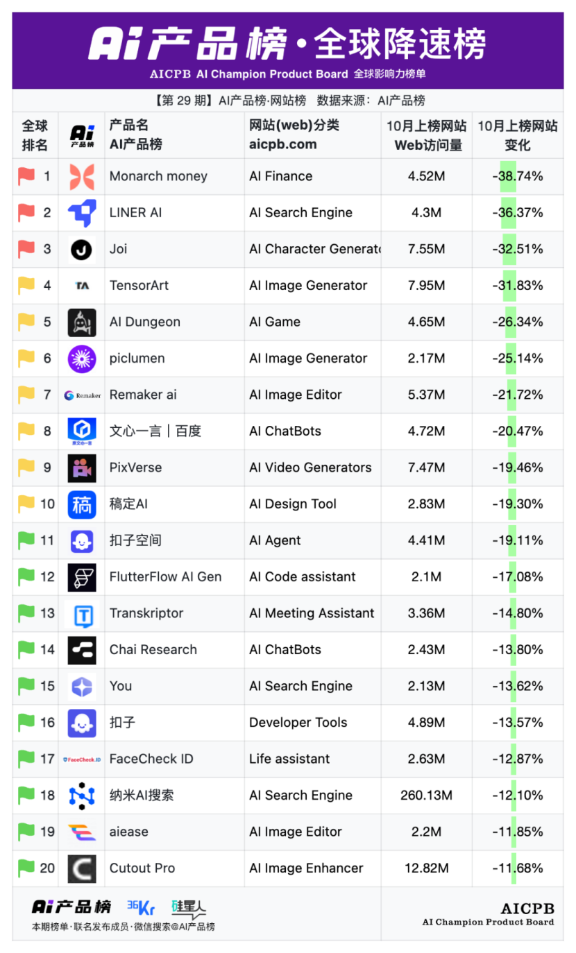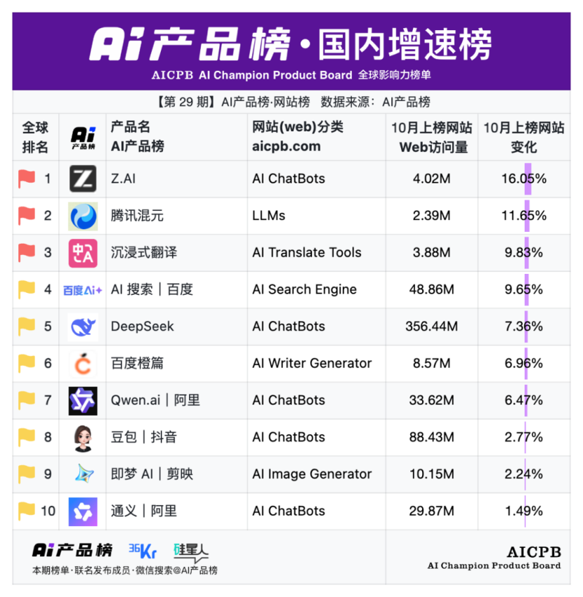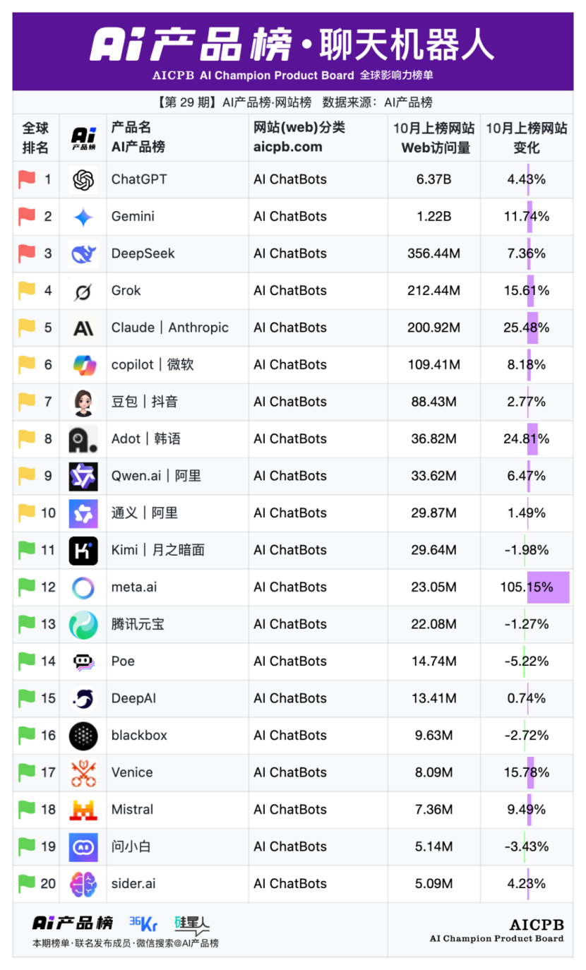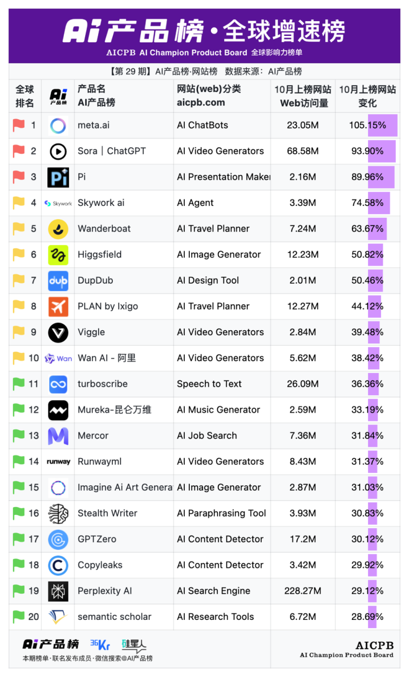 全球影响力榜单AI产品榜第29期AI产品榜·网站榜(Web)(2025年10月)由AI产品榜、36kr、硅星人联名发布。