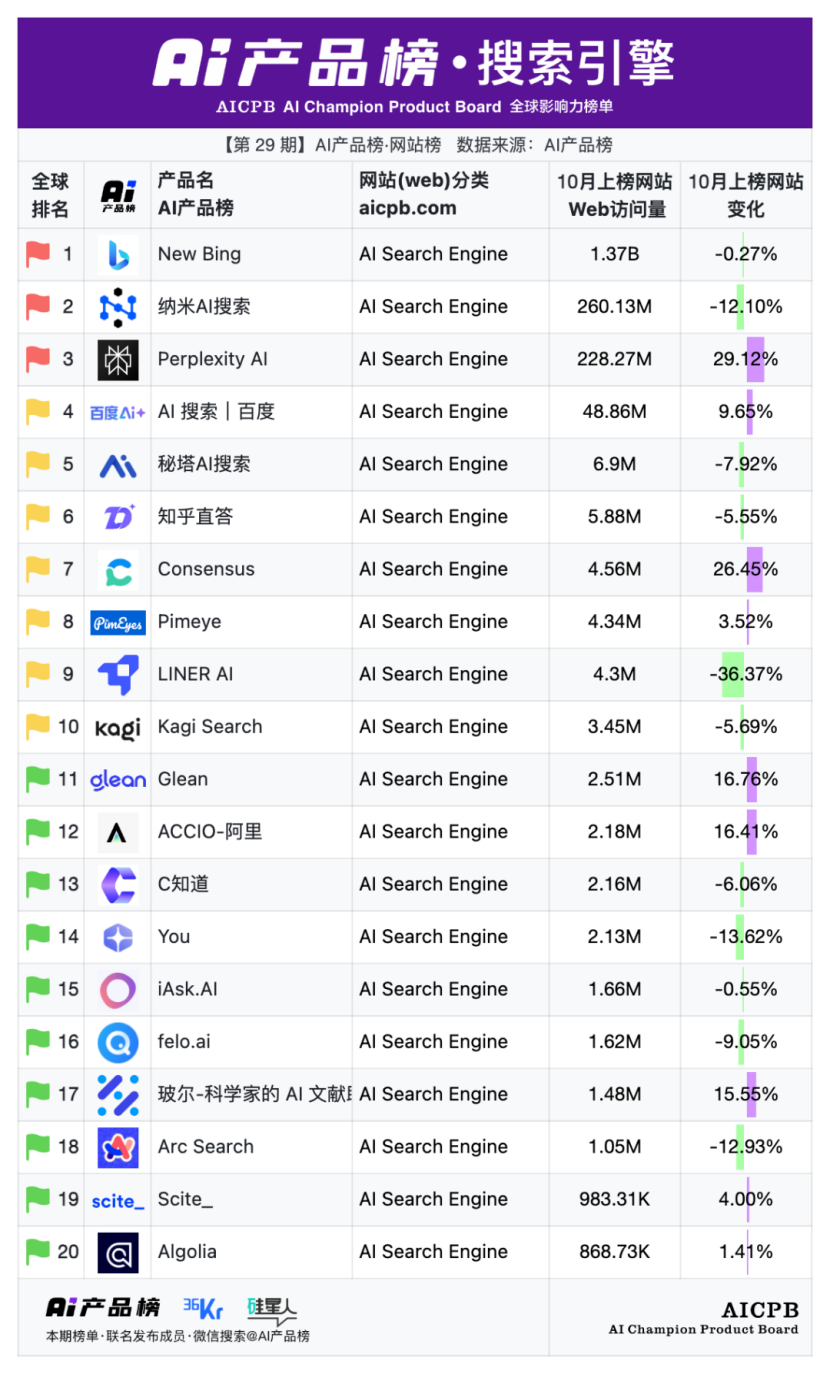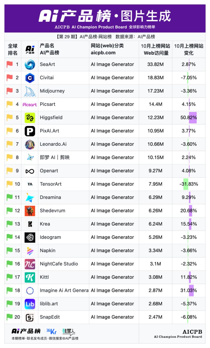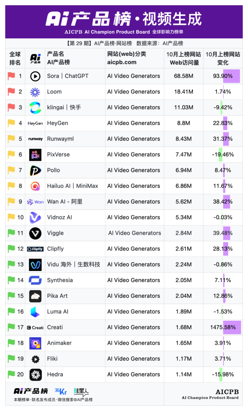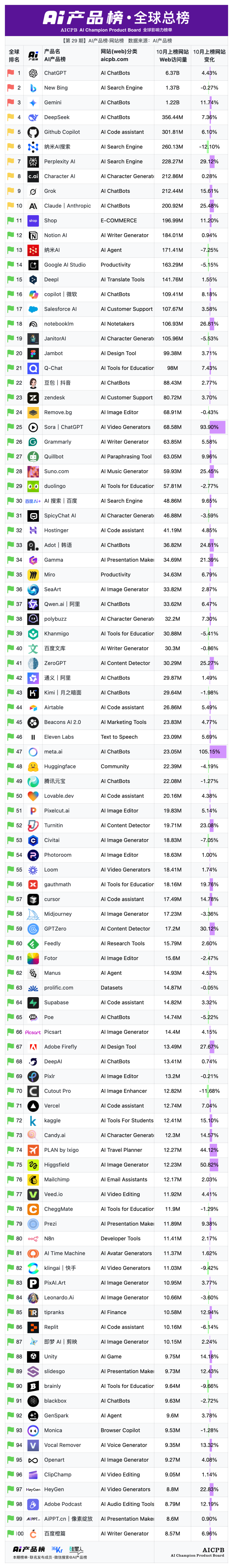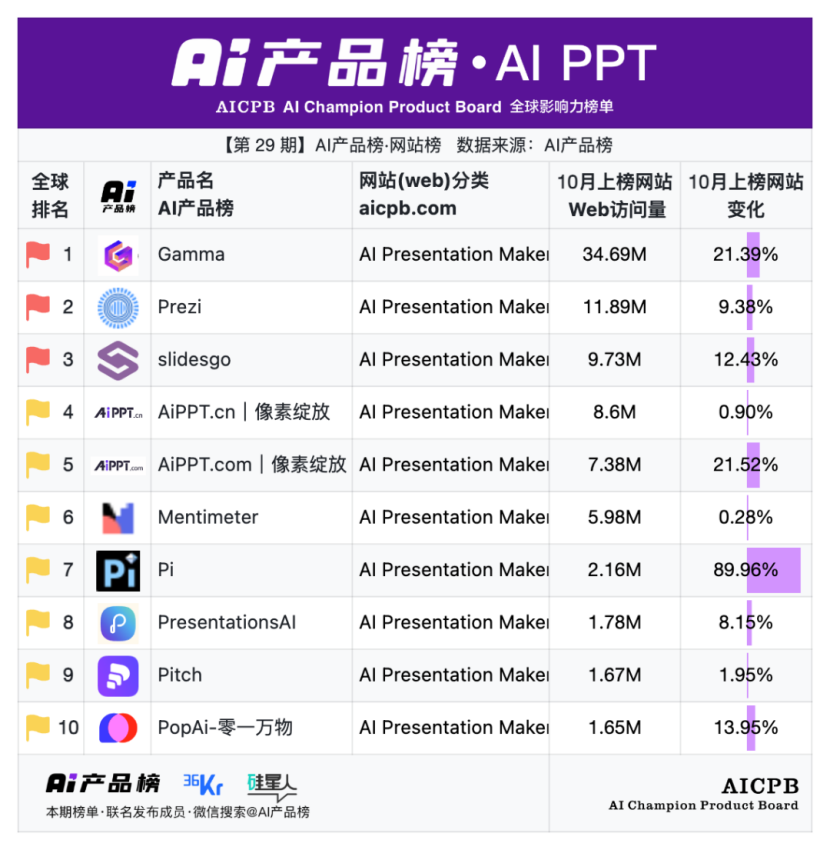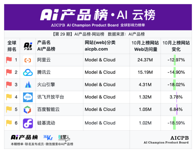 全球影响力榜单AI产品榜第29期AI产品榜·网站榜(Web)(2025年10月)由AI产品榜、36kr、硅星人联名发布。