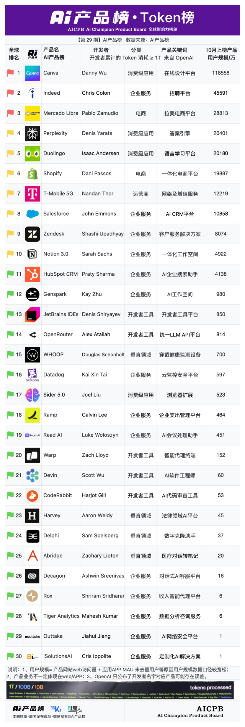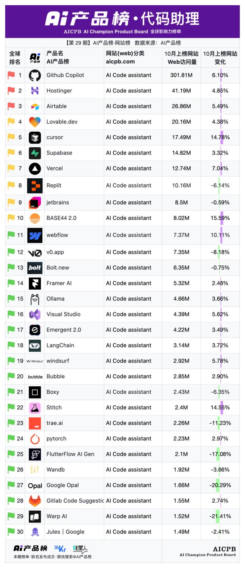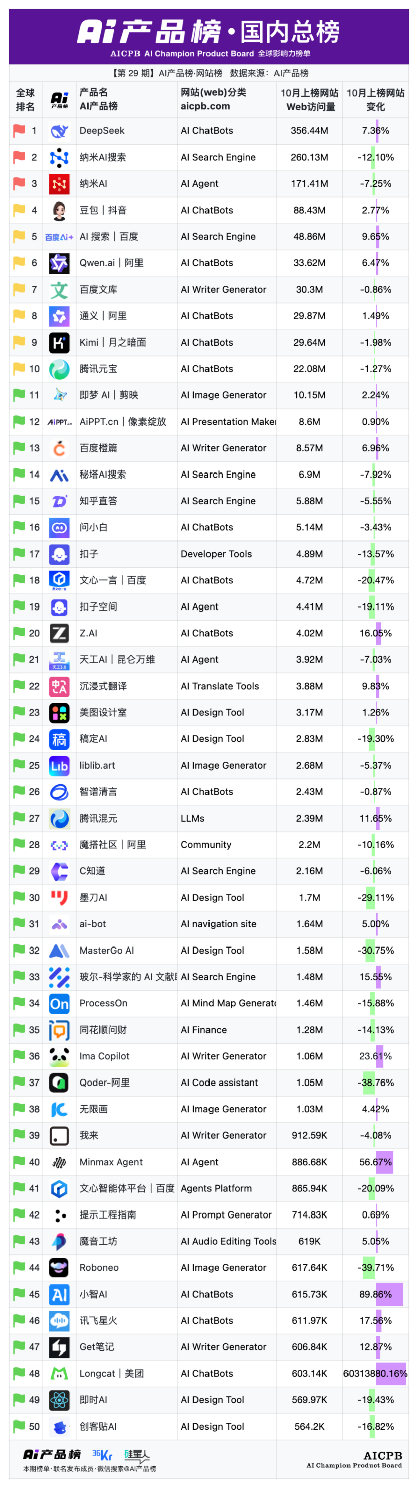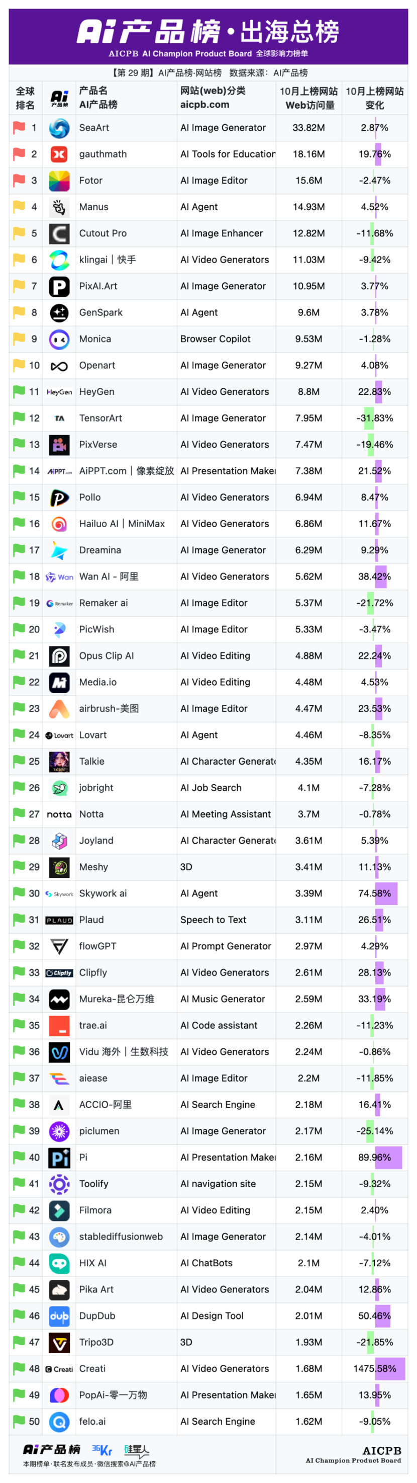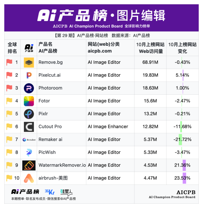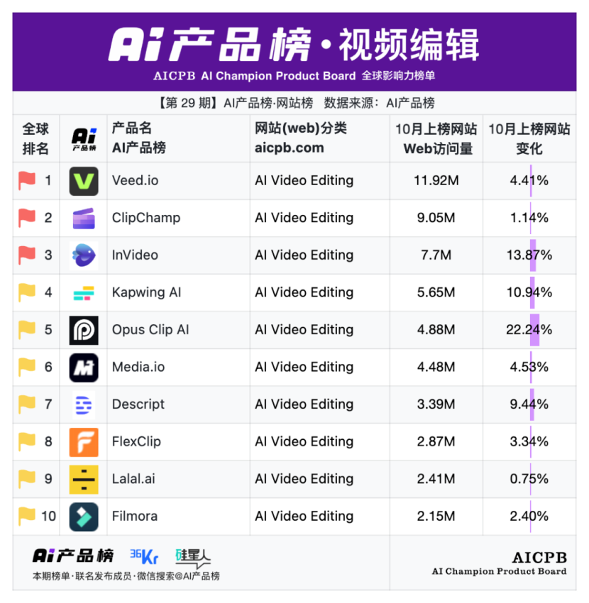 全球影响力榜单AI产品榜第29期AI产品榜·网站榜(Web)(2025年10月)由AI产品榜、36kr、硅星人联名发布。