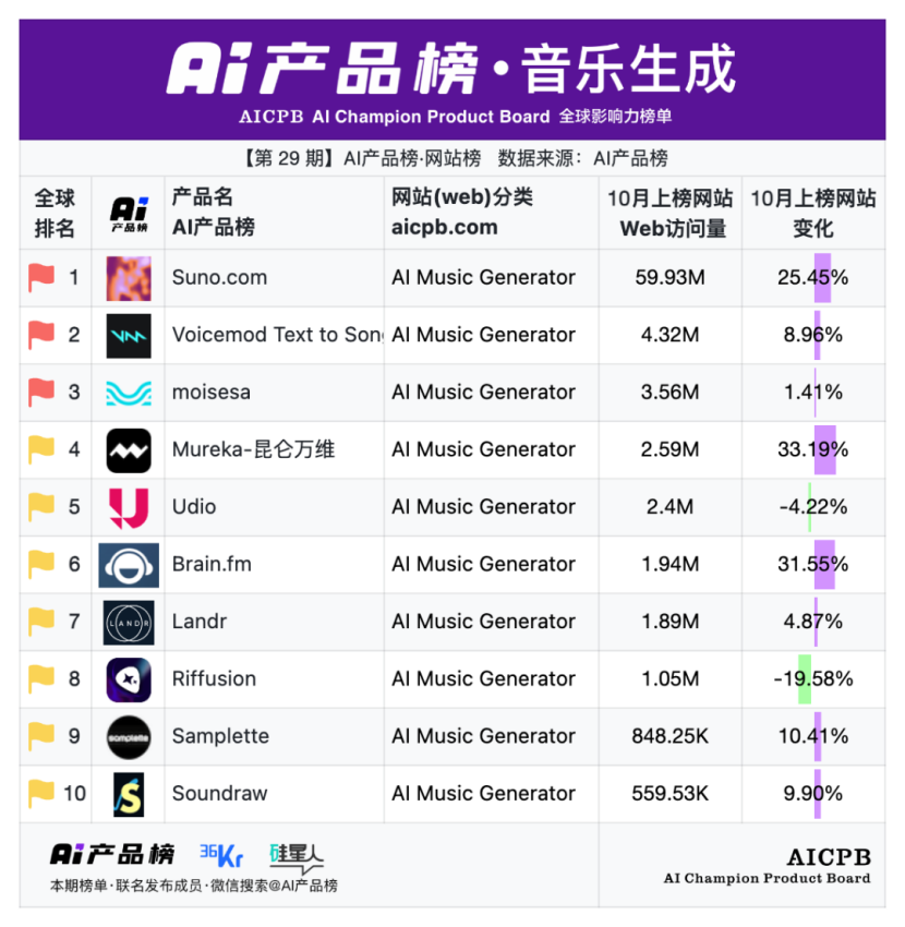 2025年10月AI产品榜·网站榜·音乐生成TOP10
