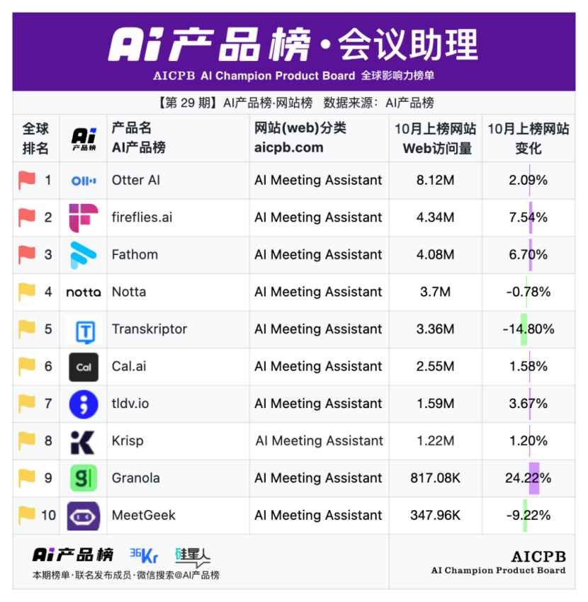 2025年10月AI产品榜·网站榜·会议助理TOP10