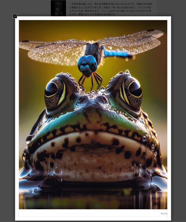 主办单位原本将一等奖颁给一张名为《这是我的头啊!》(俺の頭だぞ!)的摄影作品,画面捕捉到蜻蜓轻巧停在青蛙头上的逗趣瞬间,被评审盛赞为“兼具不可思议魅力与亲切感的佳作”。