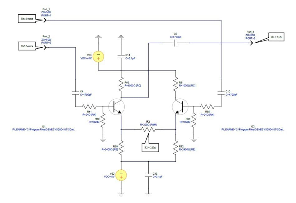 需说明的是,本设计中的差分放大器并非严格意义上的全差分放大器,而是伪差分放大器:其两个发射极未通过真实电流源耦合偏置,而是通过高阻值 “长尾电阻” 独立偏置(近似真实电流源特性),且两个发射极之间接入低阻值交叉耦合电阻以部分控制增益。该电路因结构简单,是全差分放大器的标准替代方案,且在本应用中表现优异。器件偏置点(单封装内两个器件)根据手册选择 3V-3mA,匹配该条件下的 S 参数特性;放大器增益计算公式为 G=(R3/(2R2))。