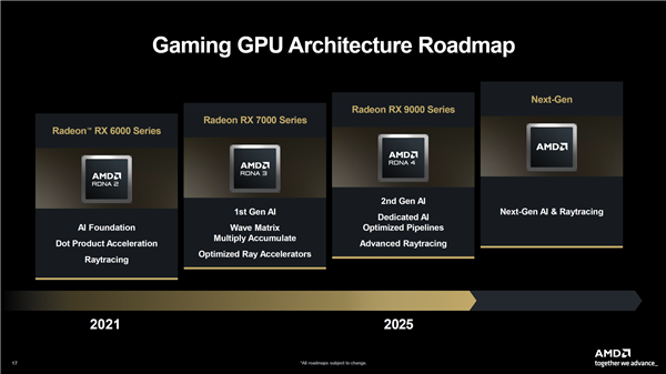 至于显卡方面,AMD仅透露了下一代游戏产品将支持下一代AI和下一代光线追踪技术,但未公布任何架构细节、具体名称或时间表路线图。