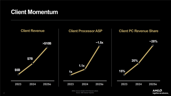 AMD还表示,受益于Ryzen和Radeon产品的成功,预计2025年客户端业务营收将达到100亿美元,平均销售价格(ASP)增长50%,PC营收份额达到约28%。