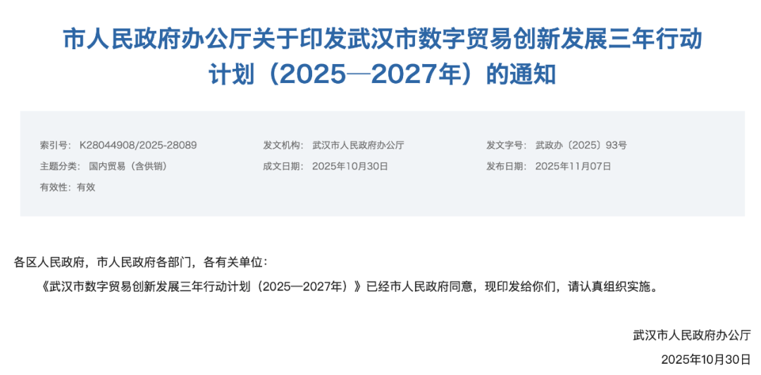C114讯 11月12日消息 近日,武汉市人民政府办公厅印发了《武汉市数字贸易创新发展三年行动计划(2025—2027年)》(下称《行动计划》)。