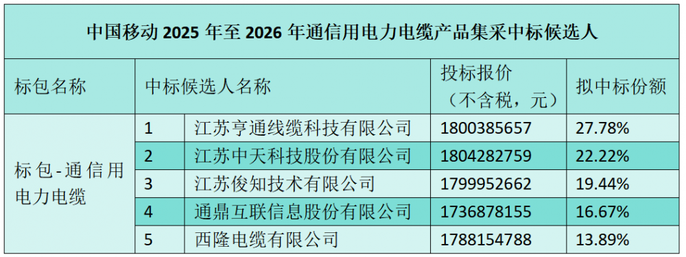 C114讯 11月12日消息(九九)中国移动采购与招标网日前发布2025年至2026年通信用电力电缆产品集中采购项目中标候选人公示,江苏亨通线缆科技有限公司等五家中标。
