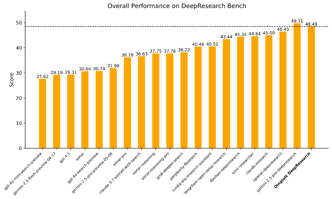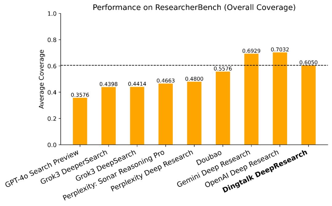 Dingtalk-DeepResearch 在国际权威深度研究评测 DeepResearch Bench 中取得 48.49 高分(全球第二、国内第一),显著超越包括 OpenAI、Claude 在内的主流系统;并在 ResearcherBench 达到 0.7032 平均覆盖率(全球第三、国内第一)。