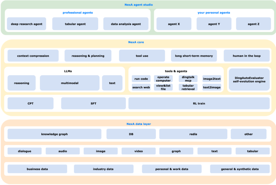 Dingtalk-DeepResearch Agent Studio:这一层提供了专业的智能体,专门用于深度研究、表格数据处理和数据分析。同时,它也支持可定制的个人智能体,以满足不同用户的特定需求。这体现了框架的 flexibility 和个性化能力。