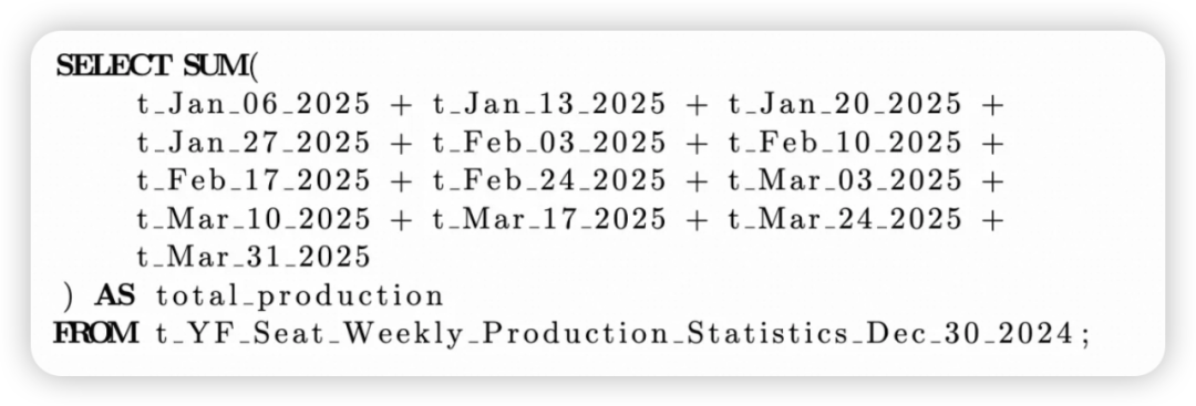 最终答案:基于执行结果,系统给出了「...2025 年第一季度...所有产品的总产量为 245036 件」的准确回答。