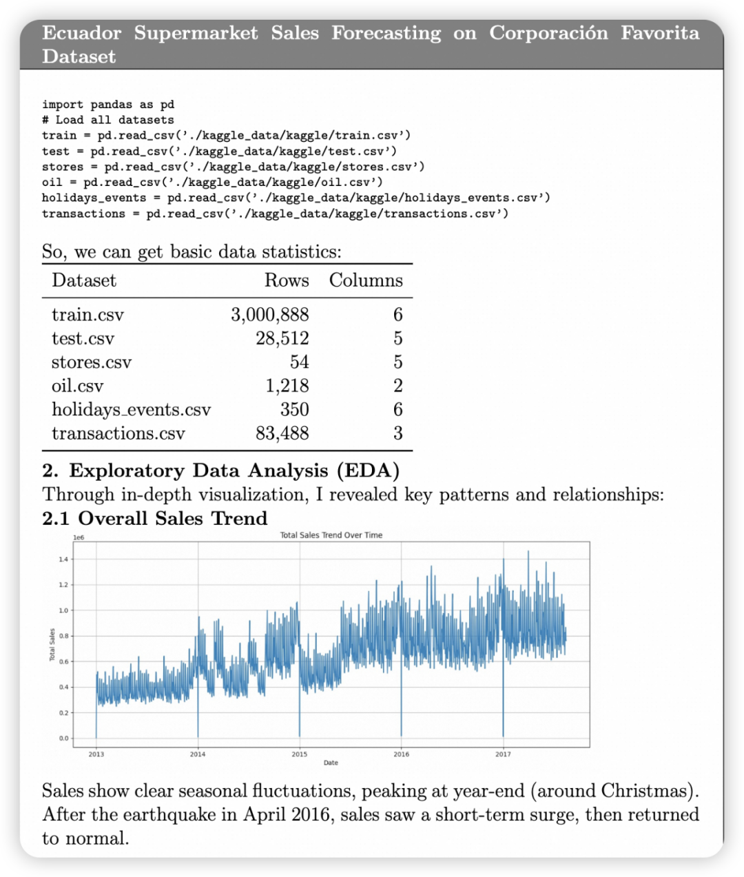 该框架还展示了其在 Kaggle 竞赛案例(厄瓜多尔超市销售预测)中的端到端自动化能力 。从源代码、数据处理、统计可视化到最终的分析报告,全部由 Dingtalk-DeepResearch 自动生成和执行,无需任何人工干预 。