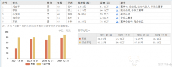 可以看出,苏爽财务管理经验十分丰富。苏爽2024年薪酬为78.43万元,相较于2023年的71.30万元,上涨了7.13万元,比公司总经理刘会平的薪酬还高,后者去年薪酬为61.63万元。