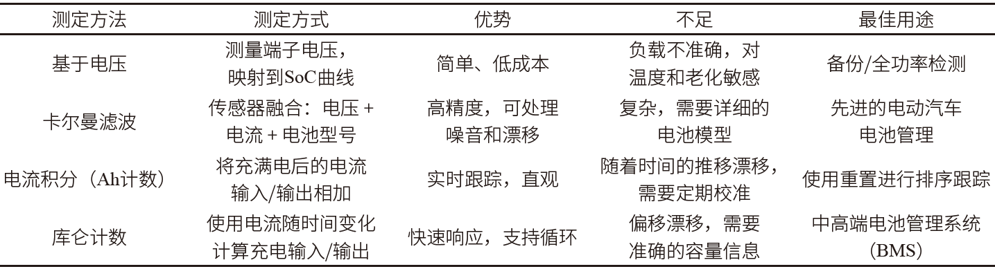 电动汽车系统通常经过优化,可以与特定的电池组配合使用,该电池组可能以可预测的方式老化或在某些电池中出现弱点。由于更换的电池的 SOC 可能与先前电池组中的值非常不同,因此需要结合能够快速评估和适应的恢复功能。设计人员通常依赖四种主要的SOC测定方法(见表1)。