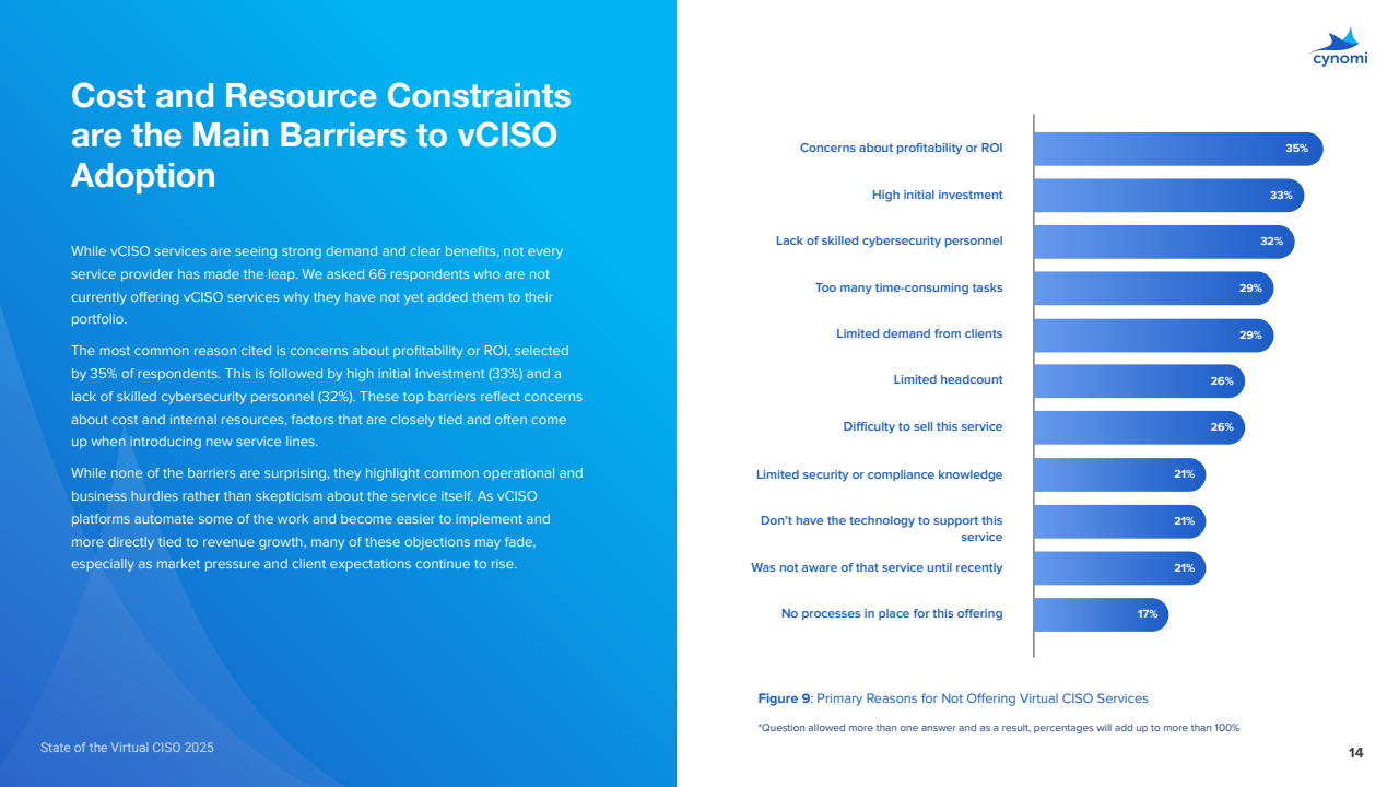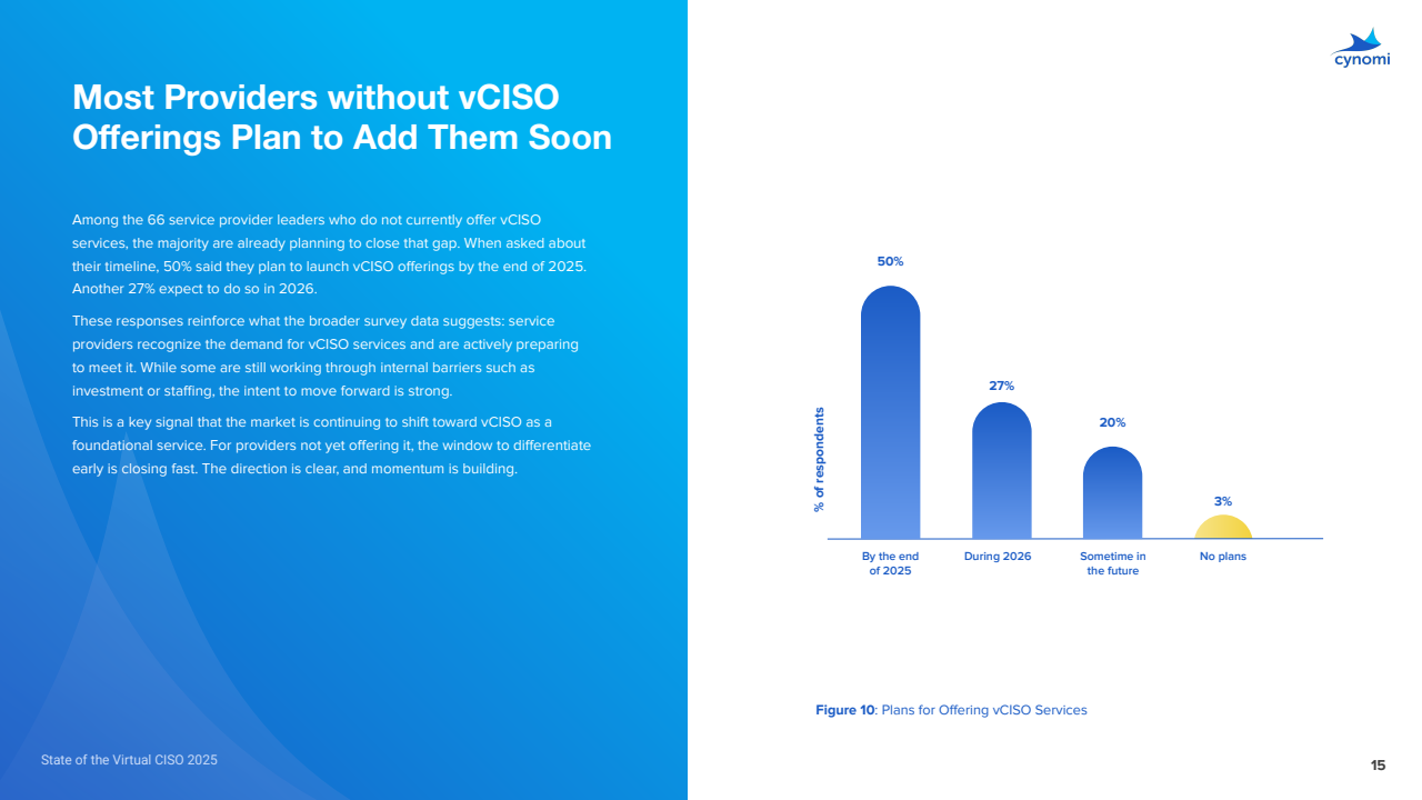 未上马者中,50%计划在2025年底前推出vCISO,27%瞄准2026年,仅3%明确无计划,显示供给端补位节奏加快。