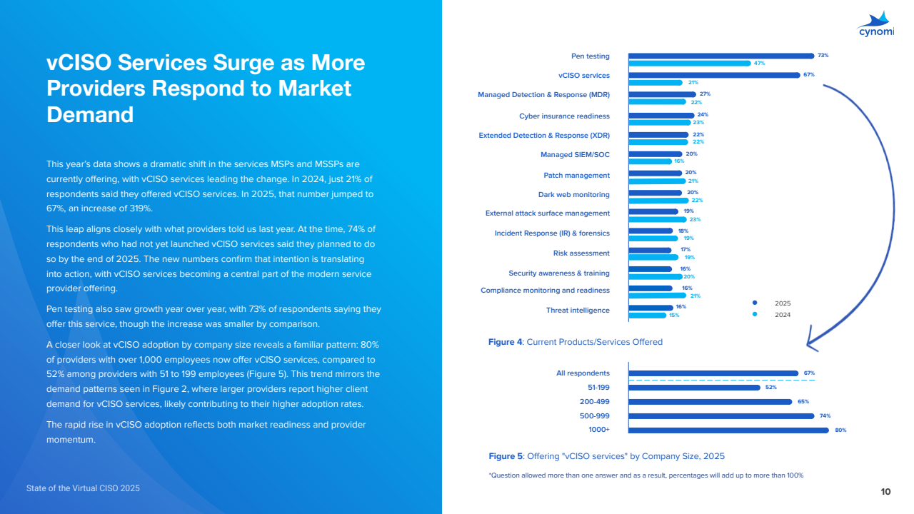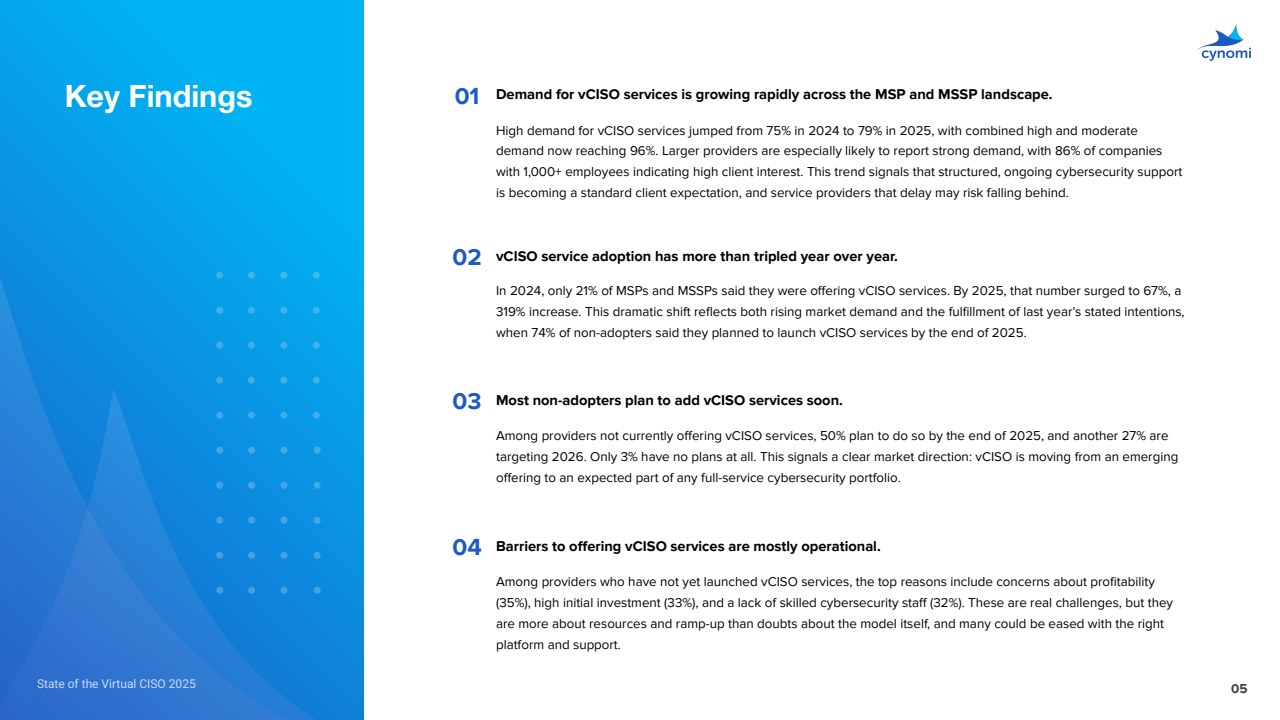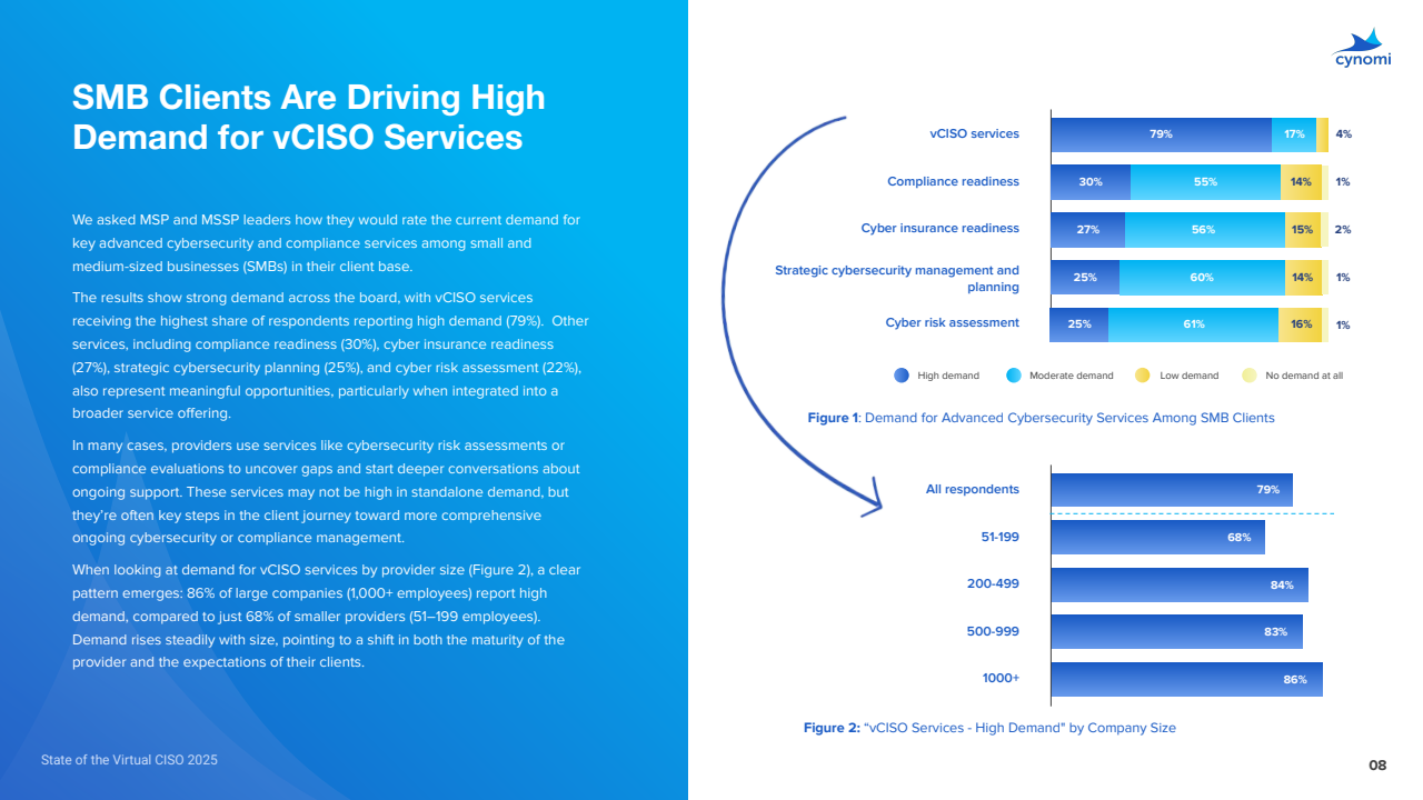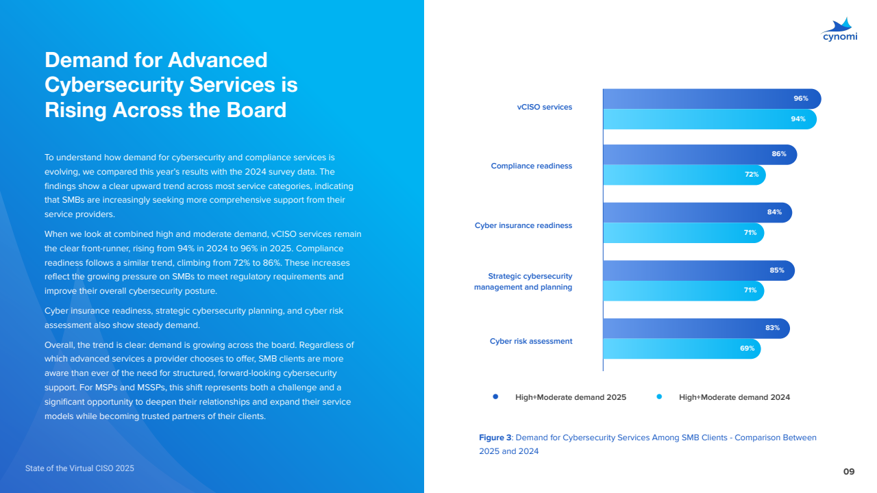 与2024年相比,合规准备的高+中需求从72%升至86%,vCISO依旧领跑,映射监管趋严与SMB安全治理意识同步抬升。
