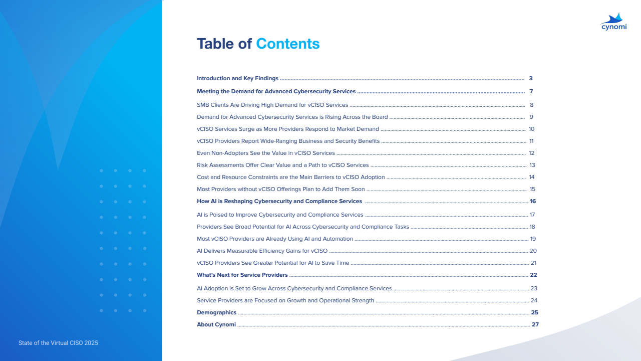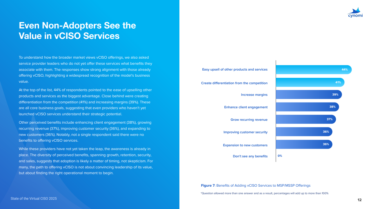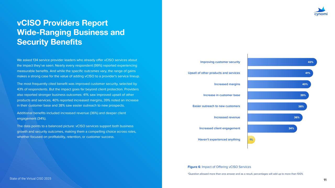 已提供vCISO的服务商,99%自述获得可衡量收益:提升客户安全43%,带动交叉销售41%,提高利润率40%,扩大客户基数39%,获客更易38%,营收提升36%,黏性增强34%。