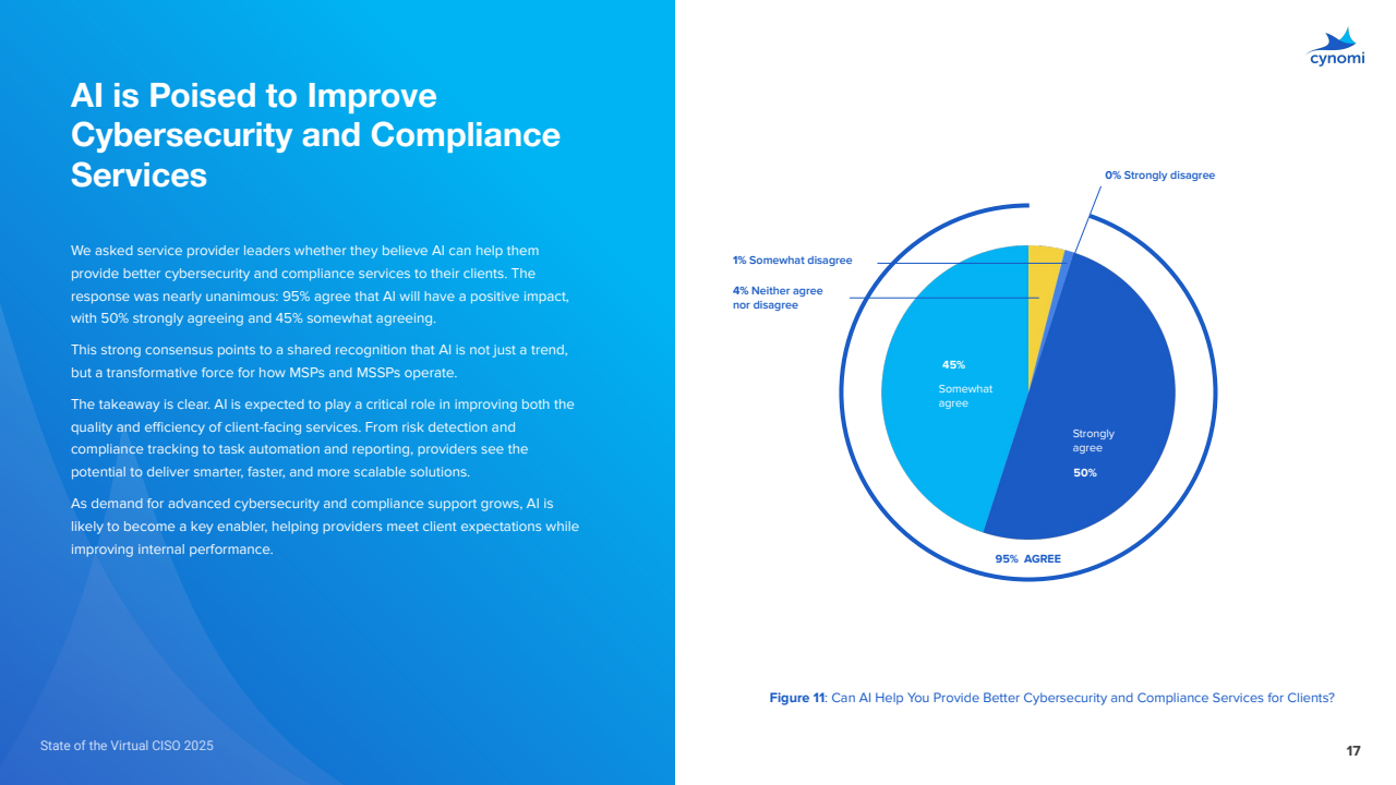 AI正成为交付杠杆:95%认为AI可提升网络安全与合规服务质量与效率,价值高频场景包括合规准备/监测46%、任务优先级40%、客户沟通39%、自动化报告38%、风险评估37%。