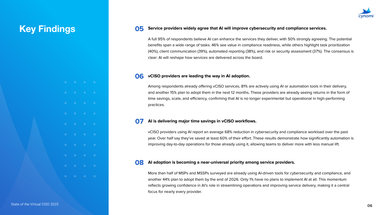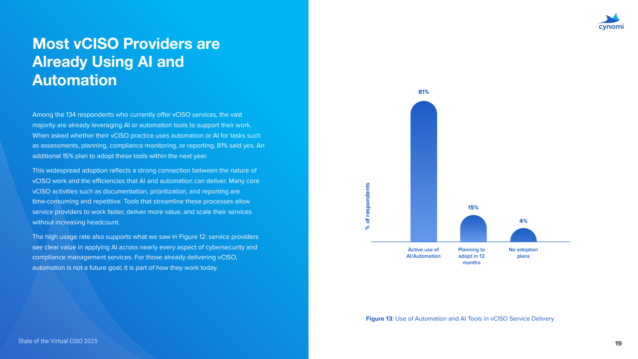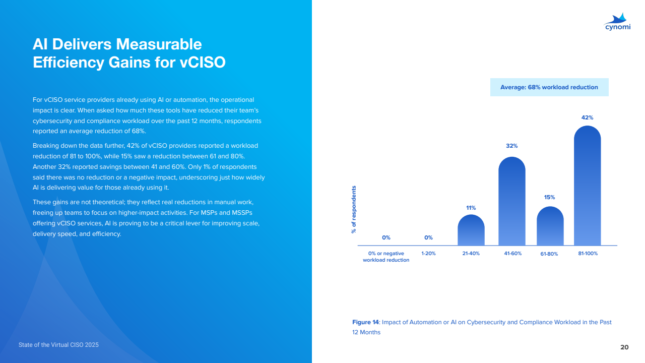 vCISO服务商中,81%已用AI/自动化,15%拟12个月内采用;过去一年平均工作量削减68%,其中国际象限为81%-100%削减占42%,61%-80%占15%,41%-60%占32%,仅1%无正向减负。