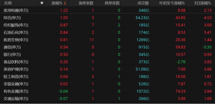 家用电器、综合、纺织服饰、石油石化、医药生物等板块收红,开能健康“20cm”涨停,三木集团、粤桂股份、南京新百、九牧王、孚日股份、康隆达、真爱美家、石化油服、淮油股份等多股涨停。