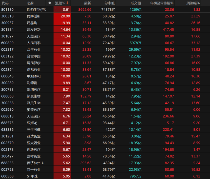 医药生物年内累计涨逾20%,博晖创新、药易购“20cm”涨停,建发致新、天益医疗涨势超过10%,人民同泰、众生药业、合富中国、济民健康、盘龙药业涨停。