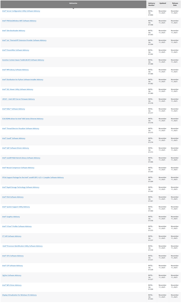 同时Intel还一口气公布了多达30项新的安全公告,涵盖了CPU、GPU、LAN、Wi-Fi等多个产品线,这些漏洞的严重程度从中等到高不等,用户需要针对CPU微码和驱动程序进行更新。